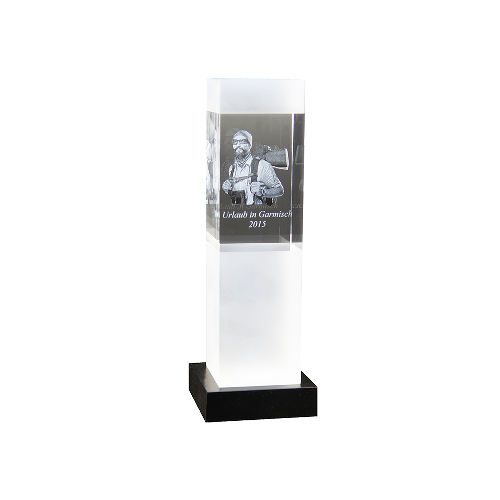 Dieser hochwertige, partiell sandgestrahlte Glasblock "Sky", gibt es in drei Größen (S 50 x 180 x 50, M 57 x 207 x 57, L 65 x 235 x 65). Er bringt Dein 3D Foto perfekt zur Geltung und sieht  mit dem passenden Leuchtsockel sehr edel aus.