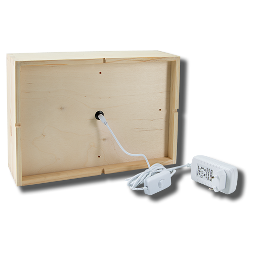 Mit einem Schalter auf der Rückseite der Leuchtstele kannst Du das LED-Licht manuel ein- und ausschalten. Ein 4,5V Netzteil sorgt für die nötige Stromzufuhr. Das kombinierte Stromkabel hat einen USB Anschluss