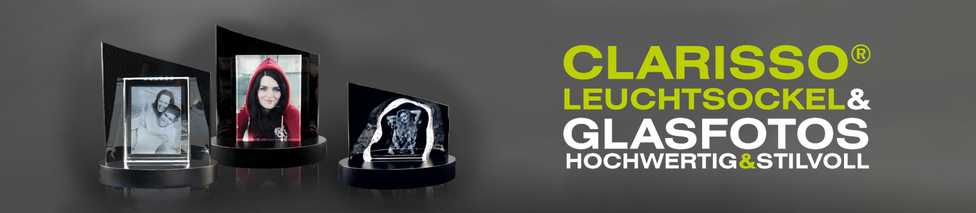 Die neuen Clarisso® Leuchtsockel in edlem Schwarz sind für eine große Auswahl an 2D und 3D Glasfotos sowie Fotodruck auf Glas in verschiedenen Ausführungen geeignet. Mit einer schwarz glänzenden, leicht gewölbten Design-Rückwand und leuchtstarken LEDs im Sockel wird Ihr Glasfoto perfekt in Szene gesetzt. Der Kunststoffsockel ist batteriebetrieben (3x Mignon AA, nicht im Lieferumfang enthalten). Optional ist ein Netzkabel erhältlich.
